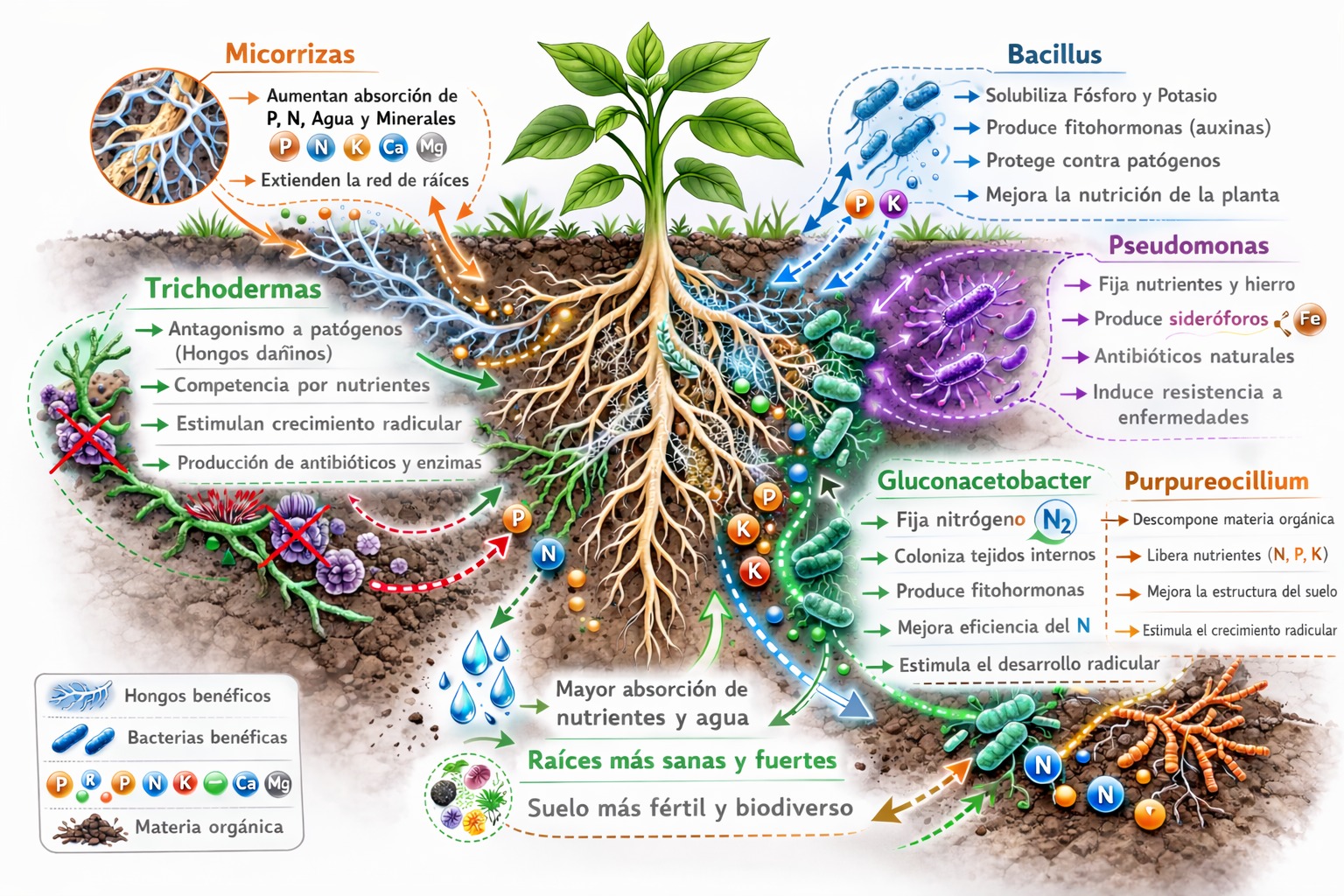 La acción conjunta de estos microorganismos favorece un equilibrio biológico que reduce la presión de enfermedades, mejora la longevidad y funcionalidad de las raíces.